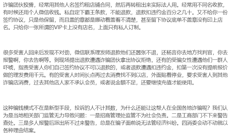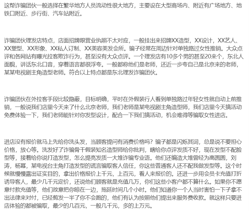 其实这种骗局全国都有,而且诈骗人员很有区域特证,大家只要看过这种骗局,遇到这种“私人订制造型”“明星造型”敬而远之就行了。