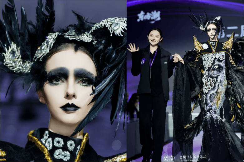 压轴登场的“东方色彩之谜”大秀,更是将整场盛典的氛围推向顶点。艺素化妆学校的老师们深度溯源秦汉雄浑、魏晋玄远、盛唐磅礴与两宋雅致四大美学巅峰,跳出形制复刻的桎梏,以“取魂弃壳”的创作巧思,完成了一场“传统美学当代解构”的惊艳实践。