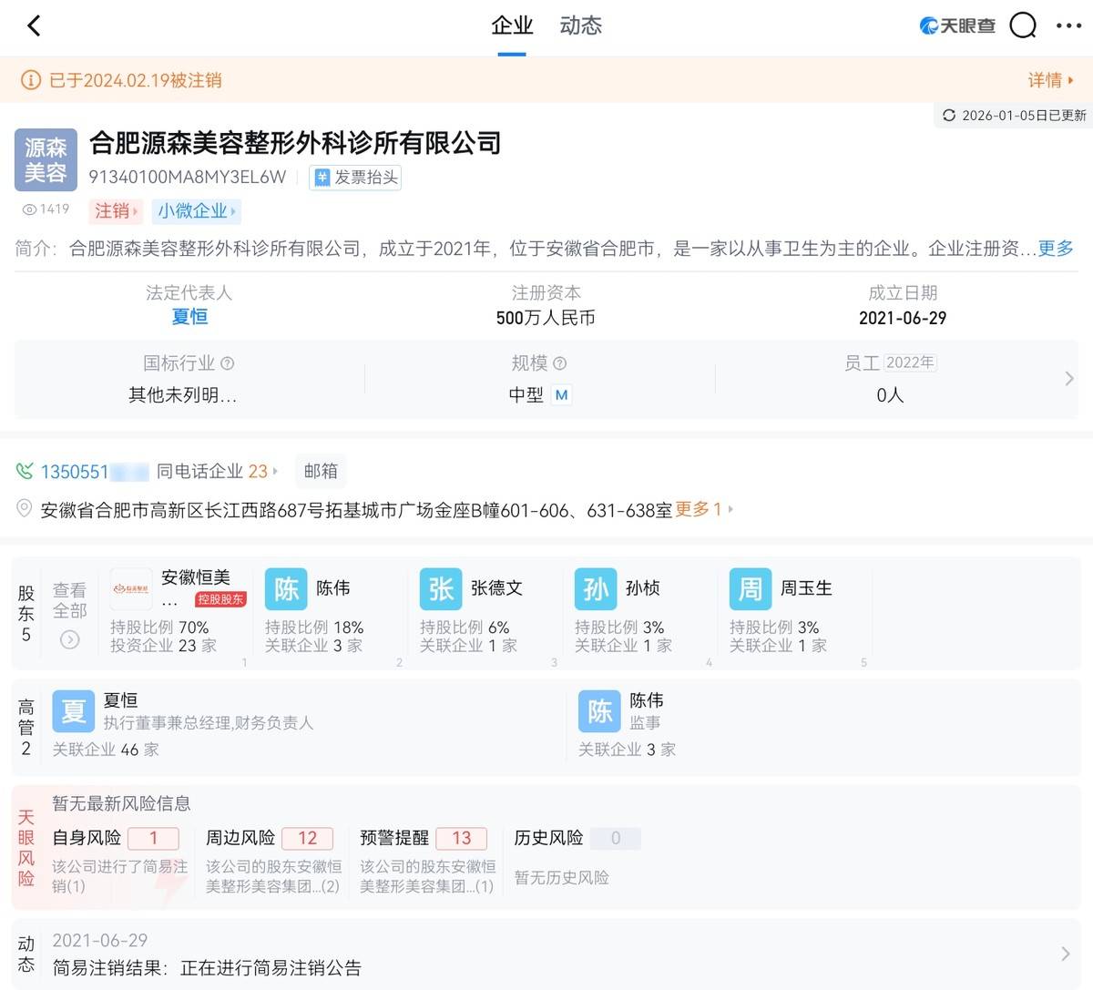 深度美业查询天眼查后发现,作为合肥恒美医疗美容医院法人的夏某,也是肥源森美容整形外科诊所的法人,该机构成立于2021年,与合肥恒美医疗美容医院一样,该机构显示的员工人数也是0人,正如上述消费者所说,合肥源森已于2024年2月19日被注销。