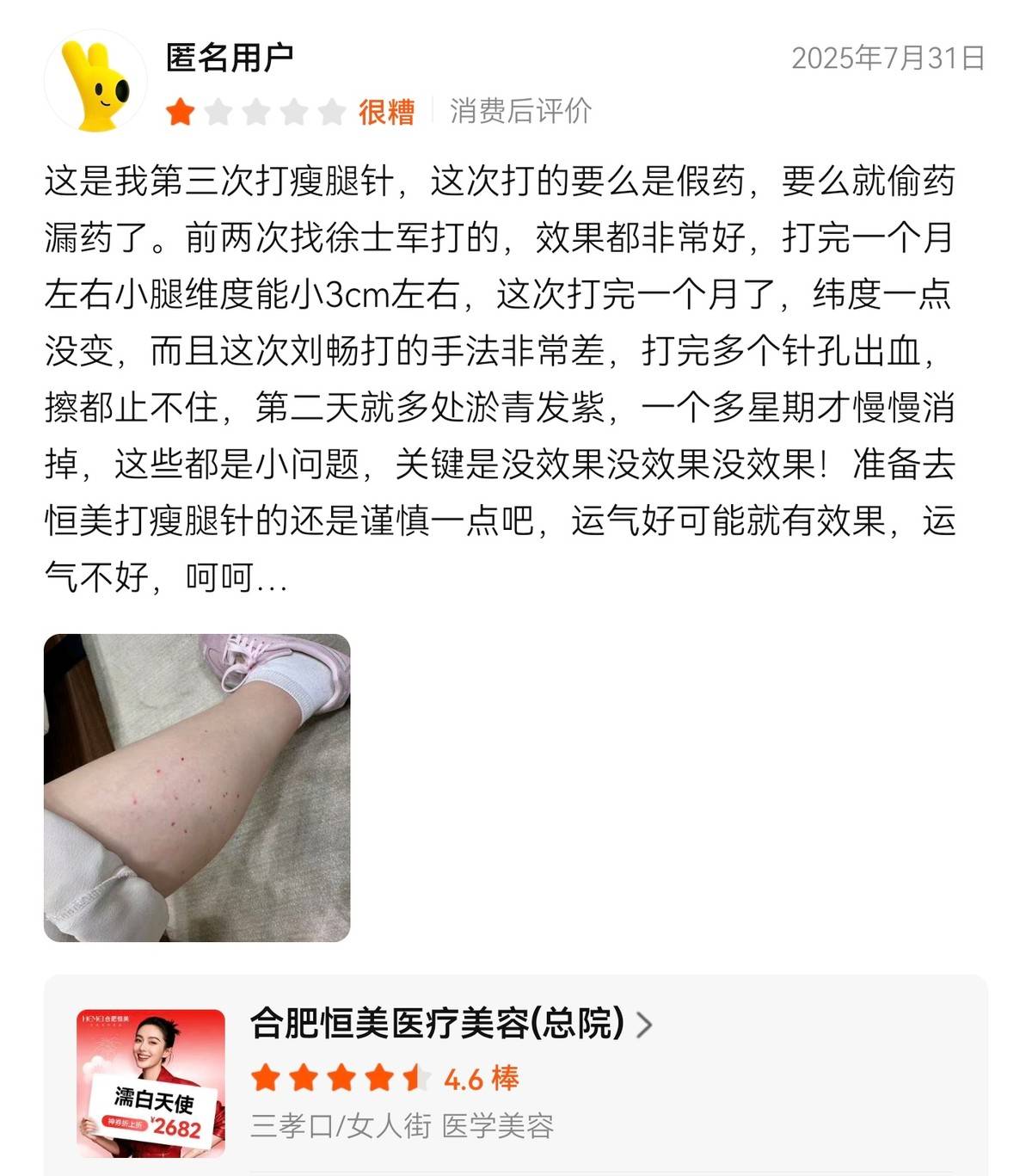 该消费者强调,出血都是小问题,关键是没效果。该消费者称准备去恒美打瘦腿针的其他消费者需要谨慎,运气好可能就有效果。