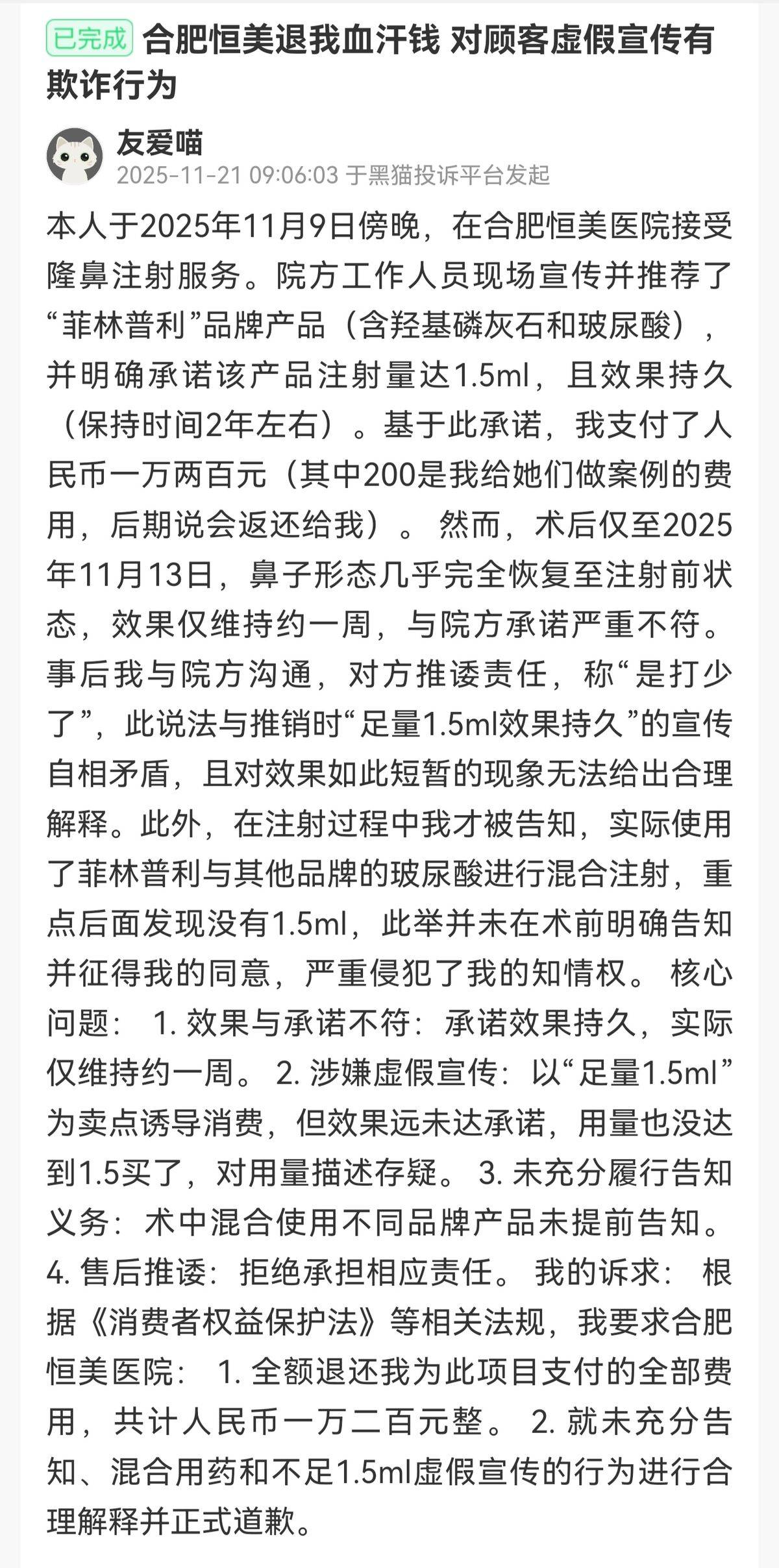 该消费者还提到,依据《消费者权益保护法》等相关法规,要求合肥恒美全额退还该项目支付的全部费用,并就未充分告知、混合用药及不足1.5ml虚假宣传的行为进行合理解释并正式道歉。截至深度美业发稿前,该投诉已于2025年12月3日由消费者申请完结。