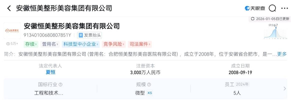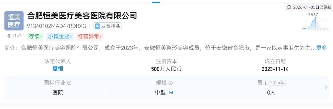 天眼查显示,合肥恒美医疗美容医院成立于2023年,隶属于合肥恒美整形美容集团,法定代表人夏某。奇怪的是,合肥恒美医疗美容2024年的参保员工人数居然是0人。